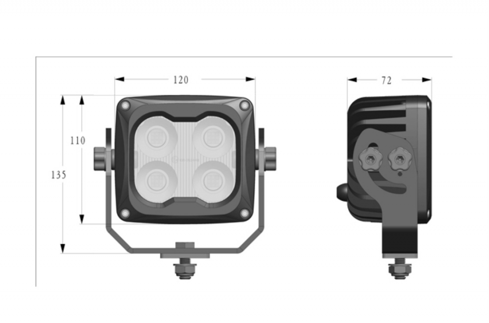 Buet arbeidslysbjelke med dobbel rekke lysdioder og flood lys-optikk for maksimal spredning. Sidefester som kan brukes til stående eller hengende montering, og justerbare fester i bunn samt sidefester. Grå farge på bjelke!