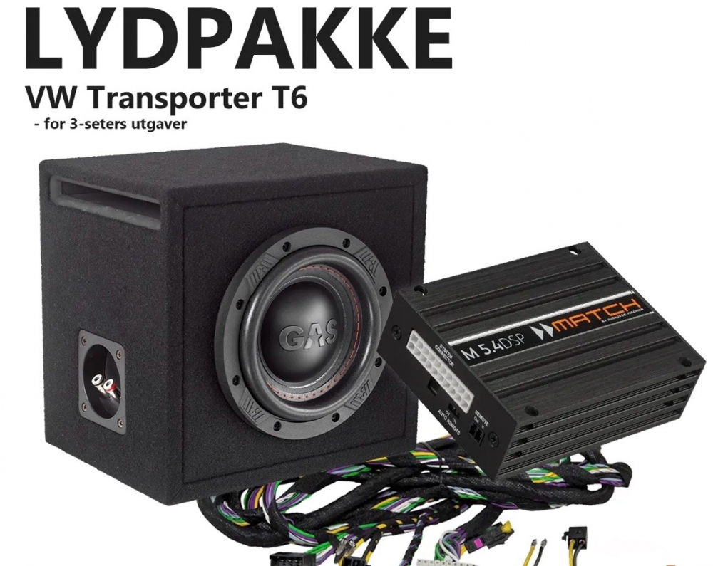 Basspakke som passer perfekt i 2-seters VW T6 varebil m/originalradio. Plug&play kabelsett.