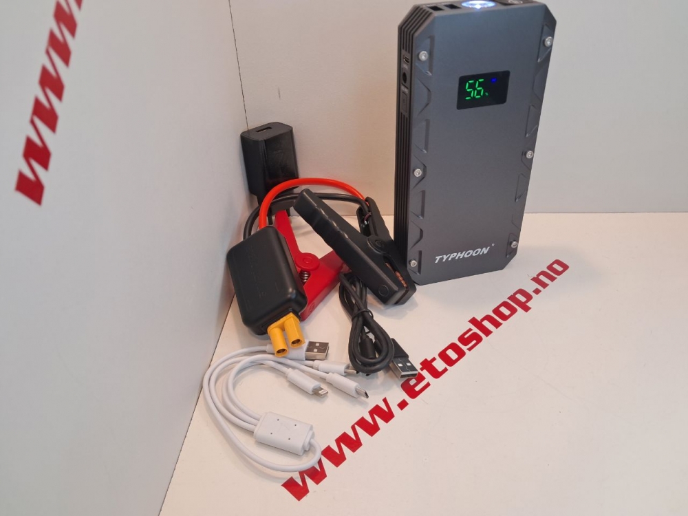 Kan brukes til både startbooster for strømtom bil, lading av telefon (følger med multi plugg som passer alle telefon typer)