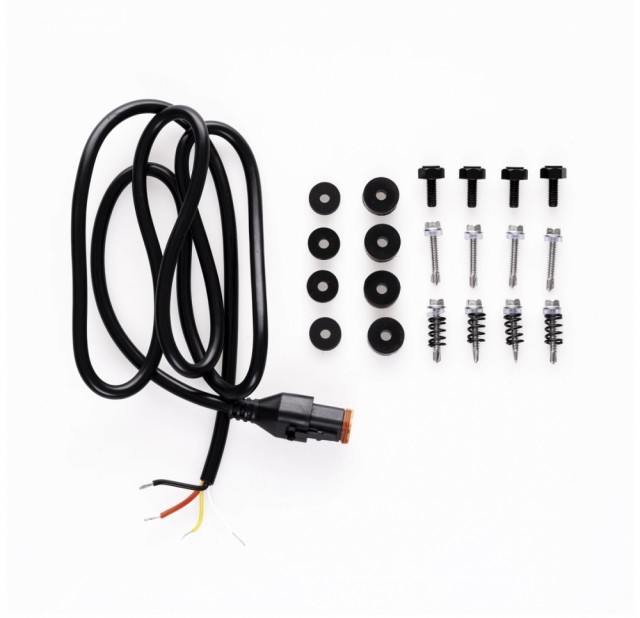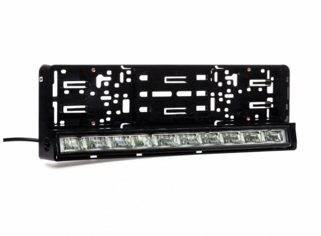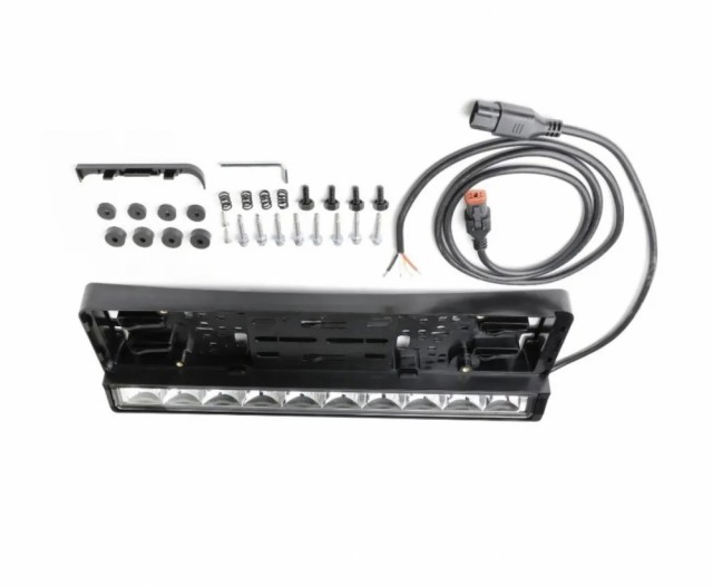 Nummerskilt holderen er svakt buet for optimal passform. Det følger med gummiklosser som kan brukes for å gi riktig passfasong til din bil. Når skiltholderen er montert kan du justere ledbaren sin lyshøyde opp og ned, tilsammen 25 grader. For å koble opp ledbaren til bilen sitt fjernlys anbefaler vi å benytte ett kabelsett med DT4 kontakt.