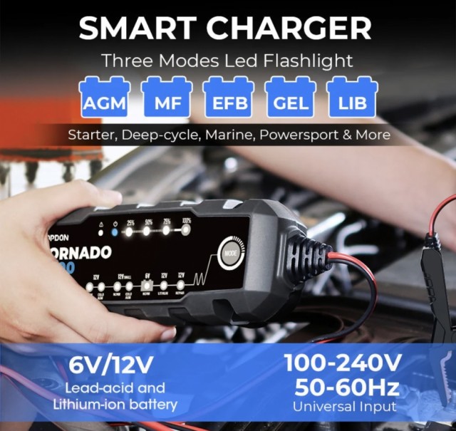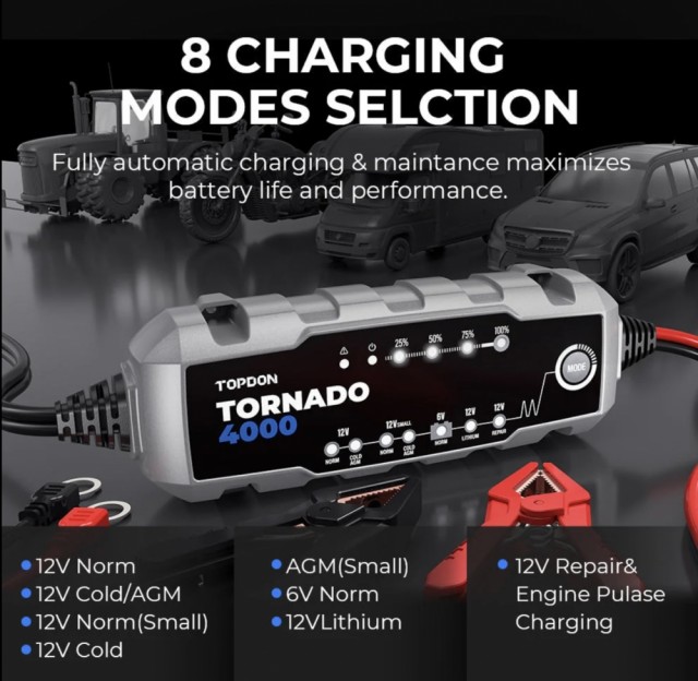 TOPDONs Tornado4000 vedlikeholdslader fungerer på alle 6V og 12V blybatterier og 12V litiumionbatterier. Den er kompatibel med vanlige oversvømmede, AGM flat plate, AGM spiral, GEL og deep-cycle batterier, egnet for alle typer kjøretøy, som biler, SUVer, motorsykler, lette lastebiler, båter, gressklippere og mer.