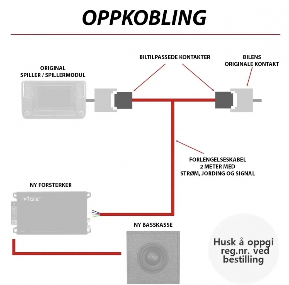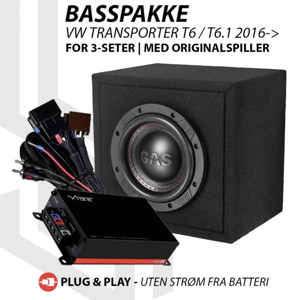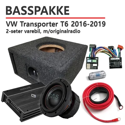 Basspakke som passer perfekt i 2-seters VW T6 varebil m/originalradio. Plug&play kabelsett.