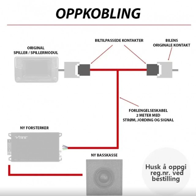 Det fine med denne løsningen er at du bare er et par hundrelapper og noen ekstra arbeidstimer unna å øke bassmengden ytterligere, dersom behovet skulle melde seg. Ved å koble ekstern strøm til forsterker (strøm fra bilens 12V-batteri) vil du kunne koble om motstanden i basskassen fra 4 ohm til 1 ohm og øke forsterkerkreftene fra VIBE-forsterkeren. Alltid en oppgradering i bakhånd, om du på senere tidspunkt ønsker deg enda mer bassmengde.