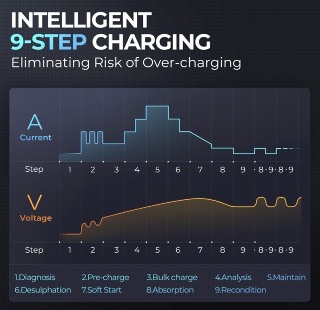 Dens "9-trinns smartlading" gir sterk beskyttelse til batteriet og det automatiske lade- og frakoblingssystemet eliminerer enhver risiko for overlading.