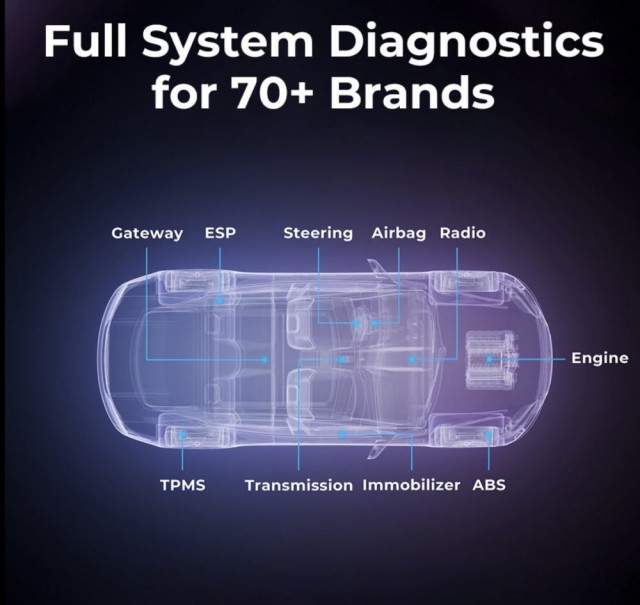 - Omfattende skanning av alle kjøretøysystemer, inkludert motor, girkasse, kollisjonspute, ABS, ESP, TPMS, immobiliser, gateway, styring, radio og klimaanlegg.